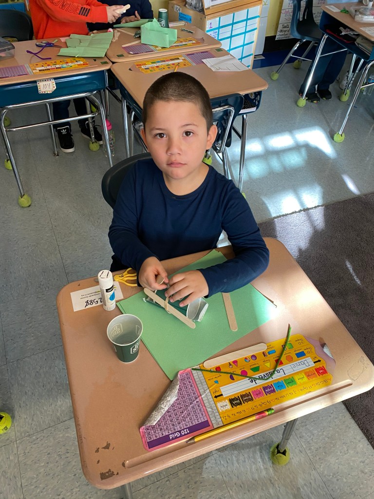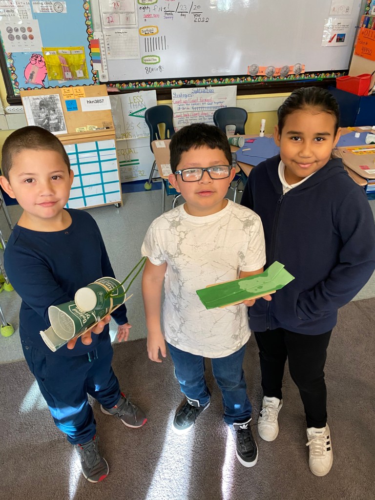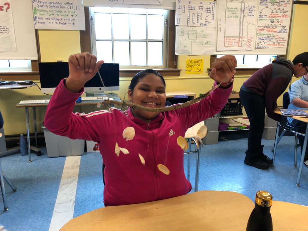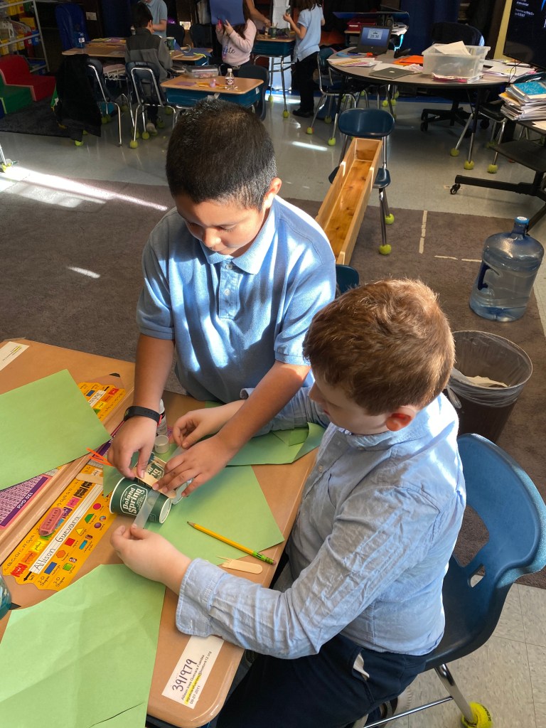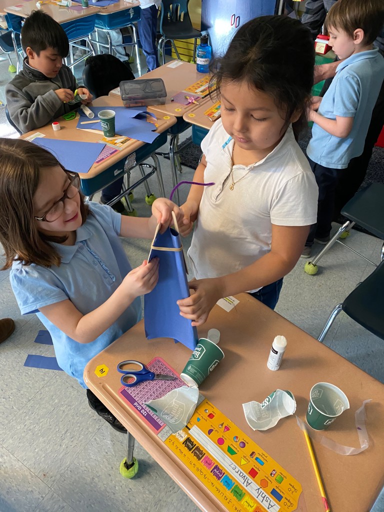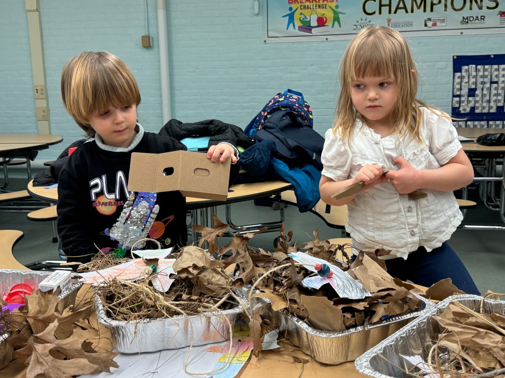 For this activity we created a flying bird, using a cardstock bird with, a hole in it, some wooden beads and twine. We tested the bird design. These birds “flew” through the school cafeteria looking for someplace to nest, How fortunate we were to find an assortment of nesting materials, both natural and manmade. One student was quick to point out that in the nests we see in the neighborhood that birds use plastic and things from the trash and recycle bins. The students created a baby bird version, to put in an egg and then designed and engineered a nest for their birds.