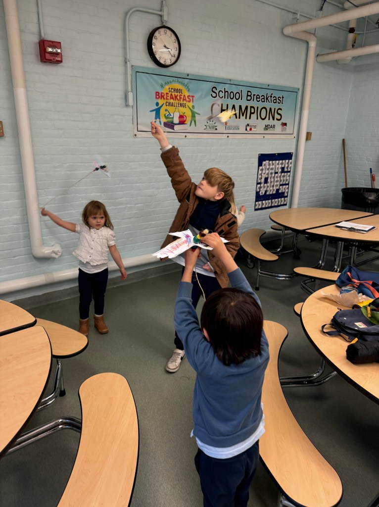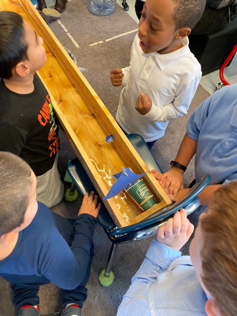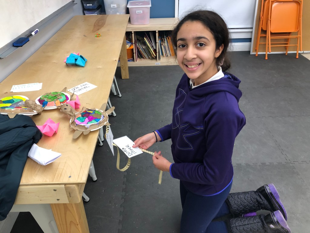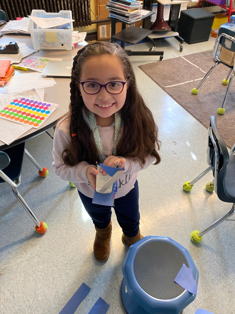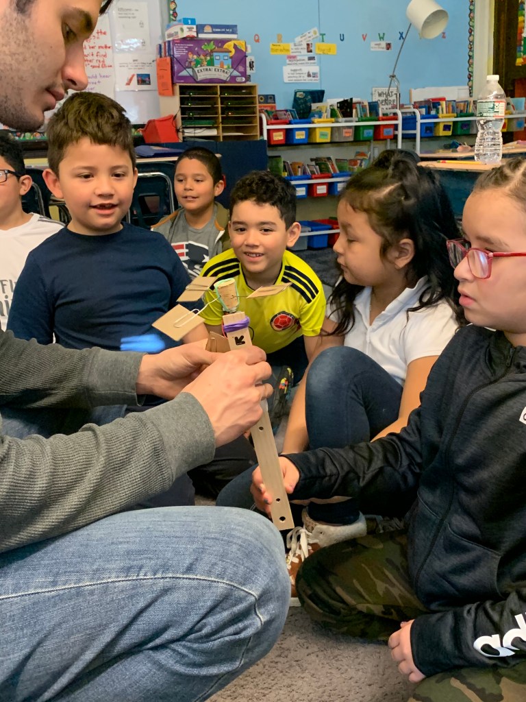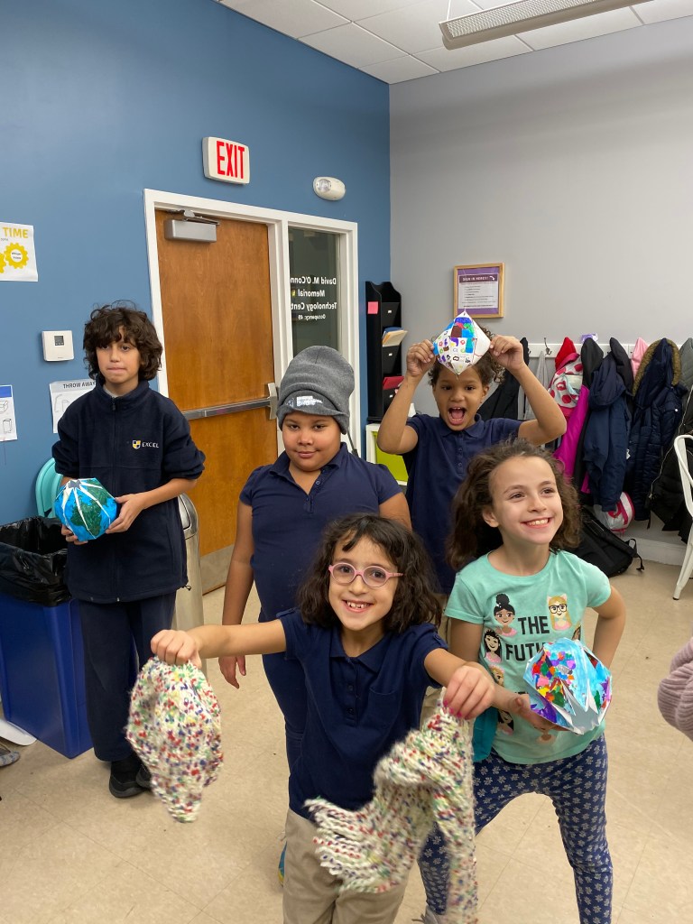 For this activity we created a flying bird, using a cardstock bird with, a hole in it, some wooden beads and twine. We tested the bird design. These birds “flew” through the school cafeteria looking for someplace to nest, How fortunate we were to find an assortment of nesting materials, both natural and manmade. One student was quick to point out that in the nests we see in the neighborhood that birds use plastic and things from the trash and recycle bins. The students created a baby bird version, to put in an egg and then designed and engineered a nest for their birds.