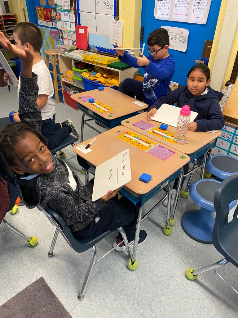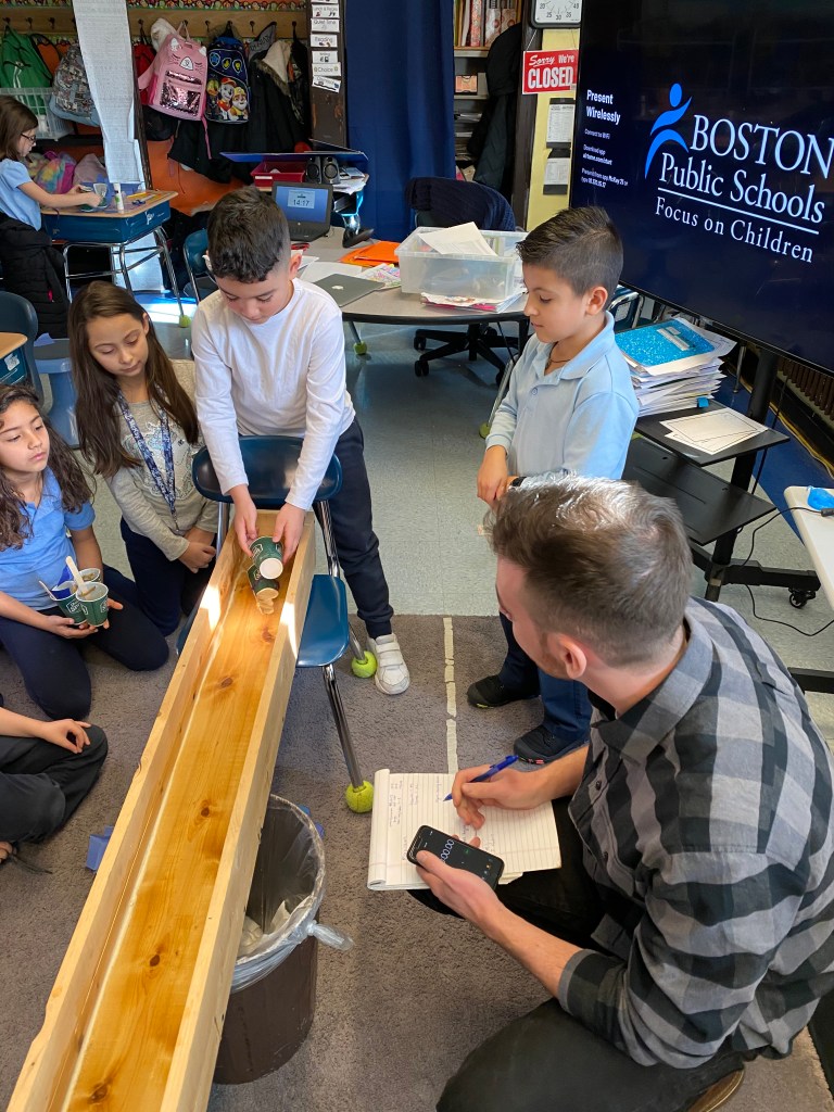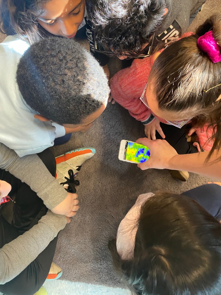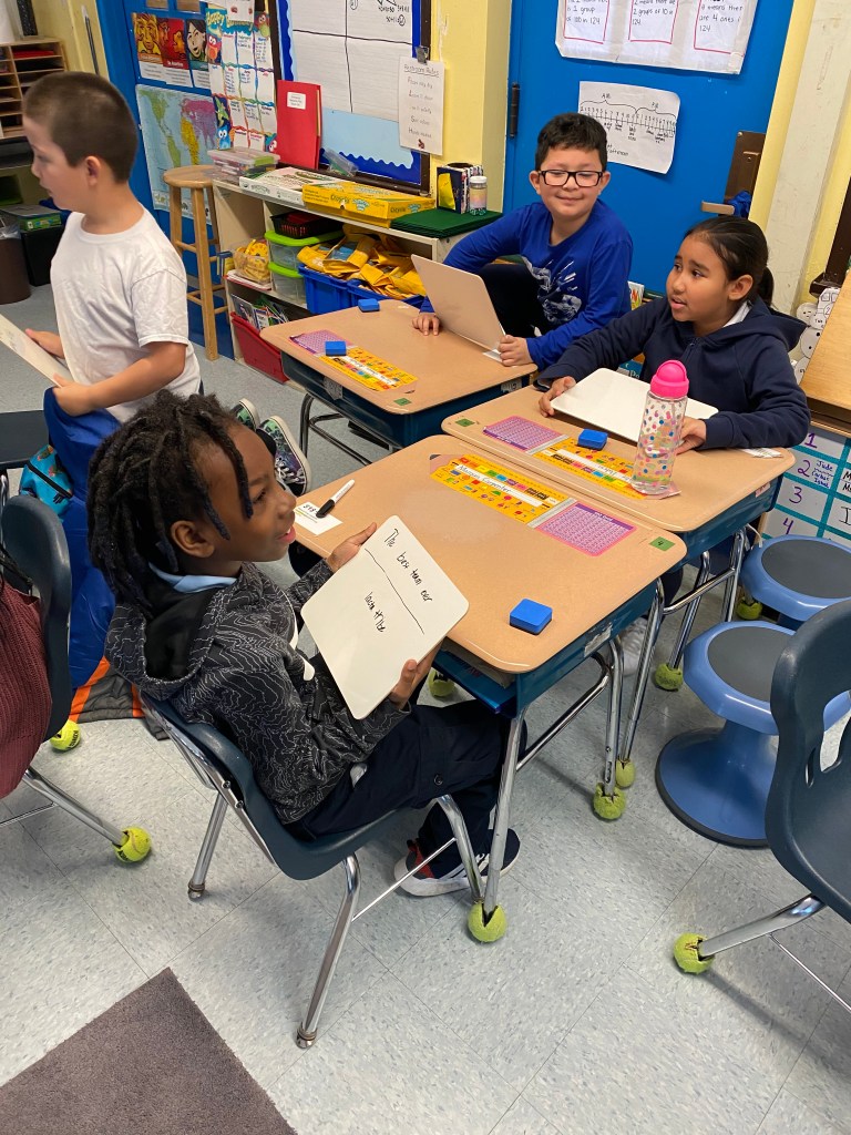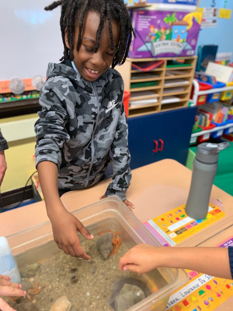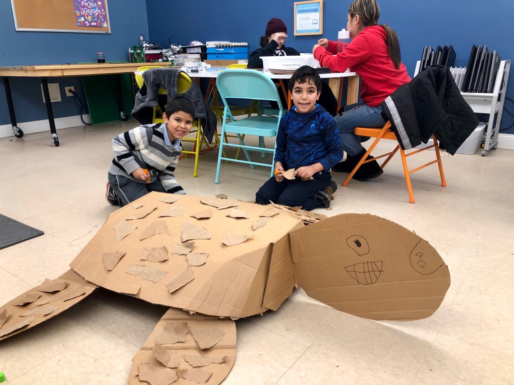 For this activity we created a flying bird, using a cardstock bird with, a hole in it, some wooden beads and twine. We tested the bird design. These birds “flew” through the school cafeteria looking for someplace to nest, How fortunate we were to find an assortment of nesting materials, both natural and manmade. One student was quick to point out that in the nests we see in the neighborhood that birds use plastic and things from the trash and recycle bins. The students created a baby bird version, to put in an egg and then designed and engineered a nest for their birds.
